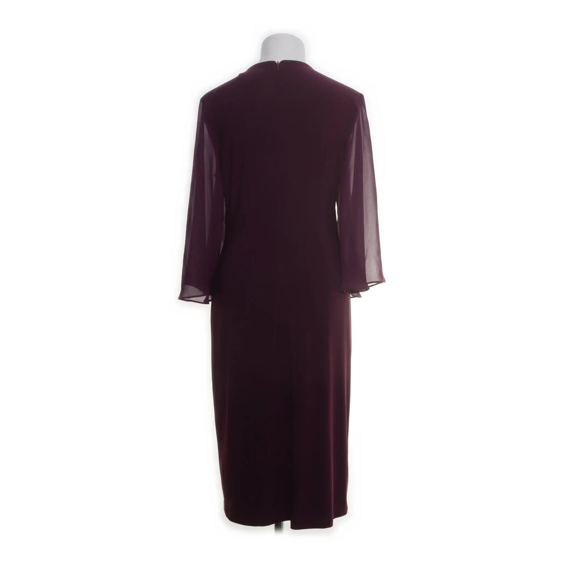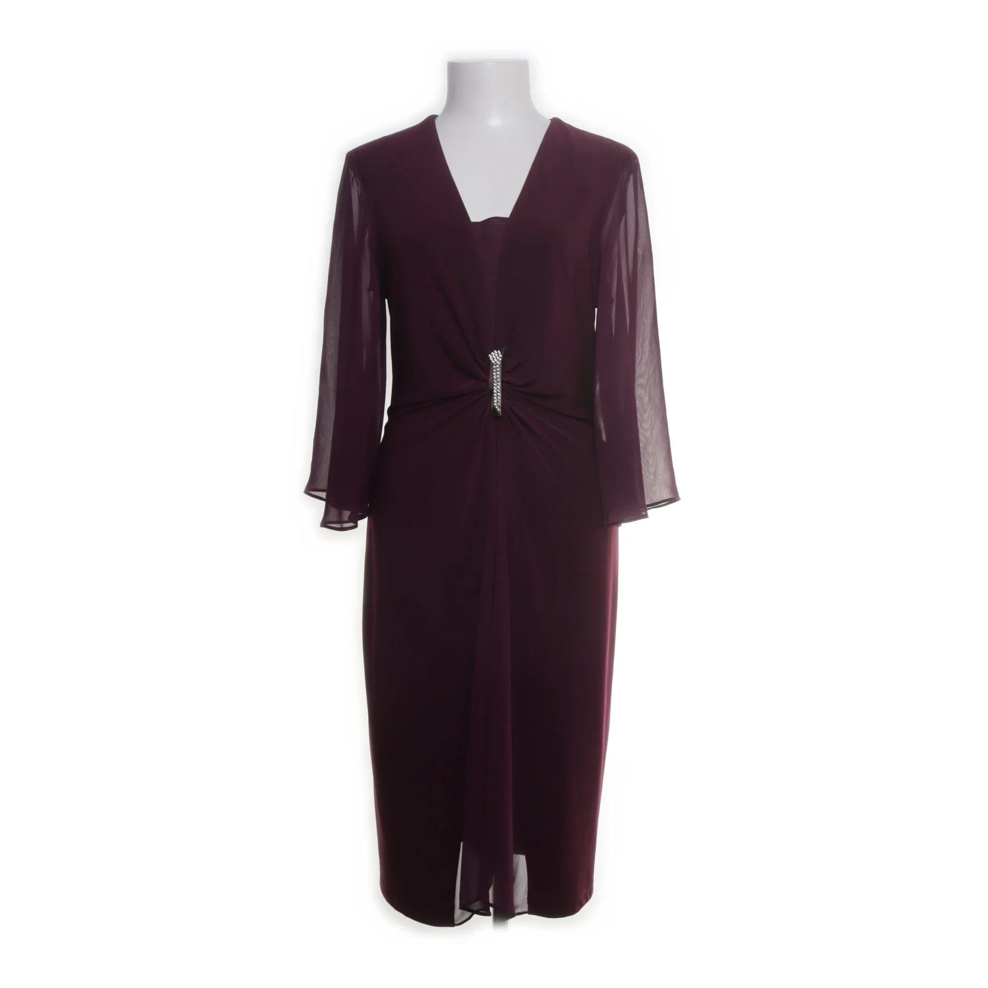 Lila festklänning i färgen Mullberry från Joseph Ribkoff. V-ringning med ett spänne fram i midjan som framhäver din silhuett. Skira lite längre fjärilsärmar. Mjukt och stretchigt material som sitter bekvämt mot kroppen.