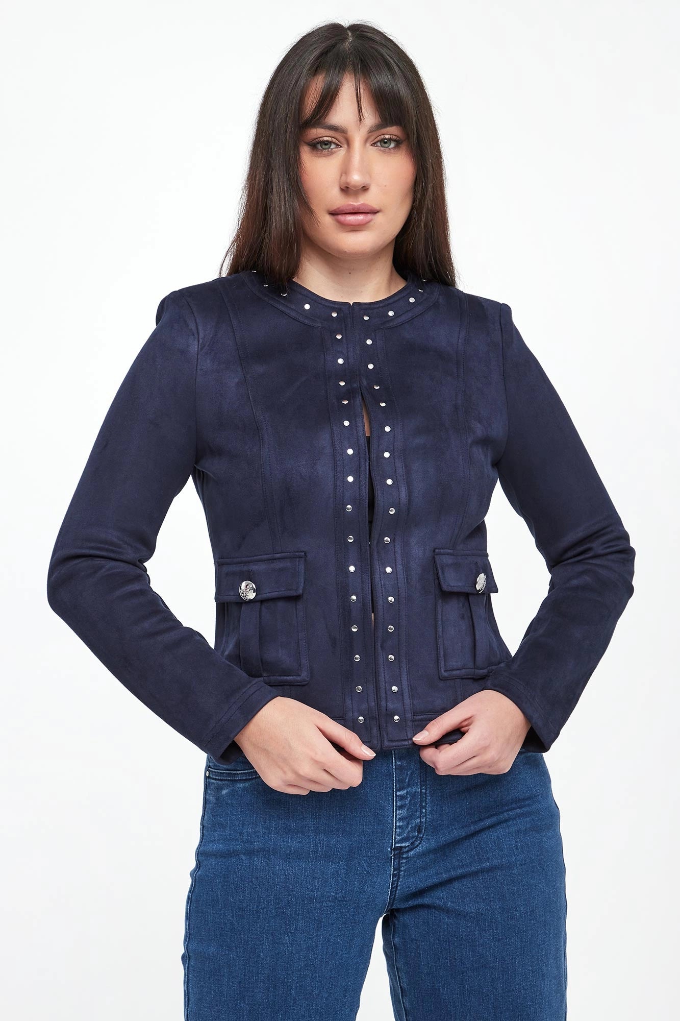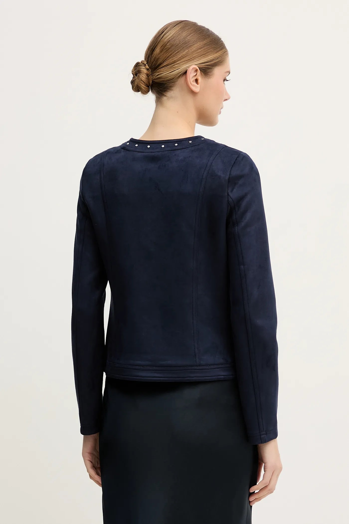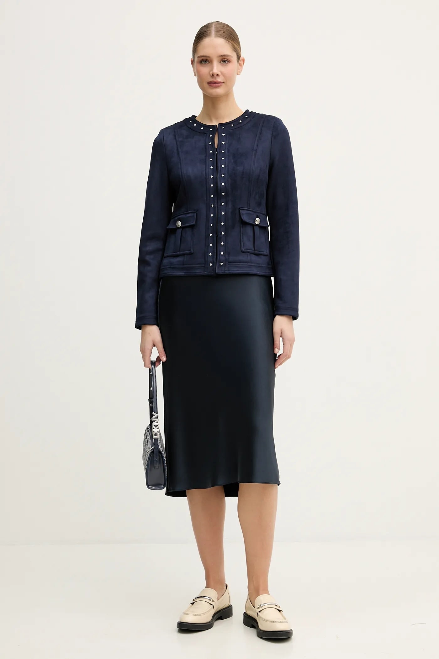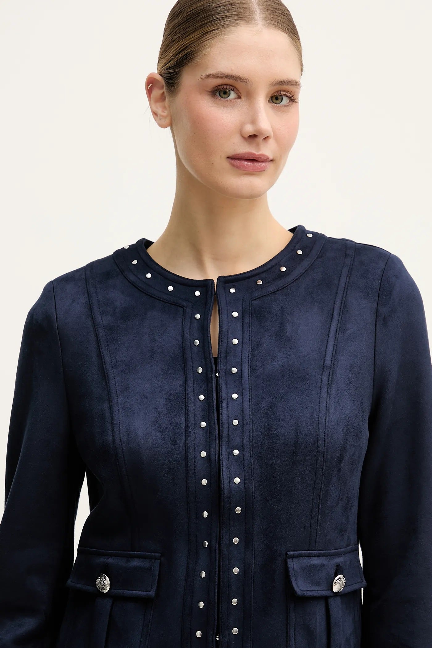 Denna Joseph Ribkoff-jacka i falskmocka kombinerar förfinat hantverk med praktisk design. Med en crewneck och rak passform är den detaljerad med en nitkrage och militärinspirerade knappar som ger en distinkt kant. Funktionella fickor ökar funktionaliteten, medan krok-och-öga-stängningen säkerställer en säker och polerad finish. Idealiskt för dem som söker ett sofistikerat men ändå mångsidigt ytterplagg.