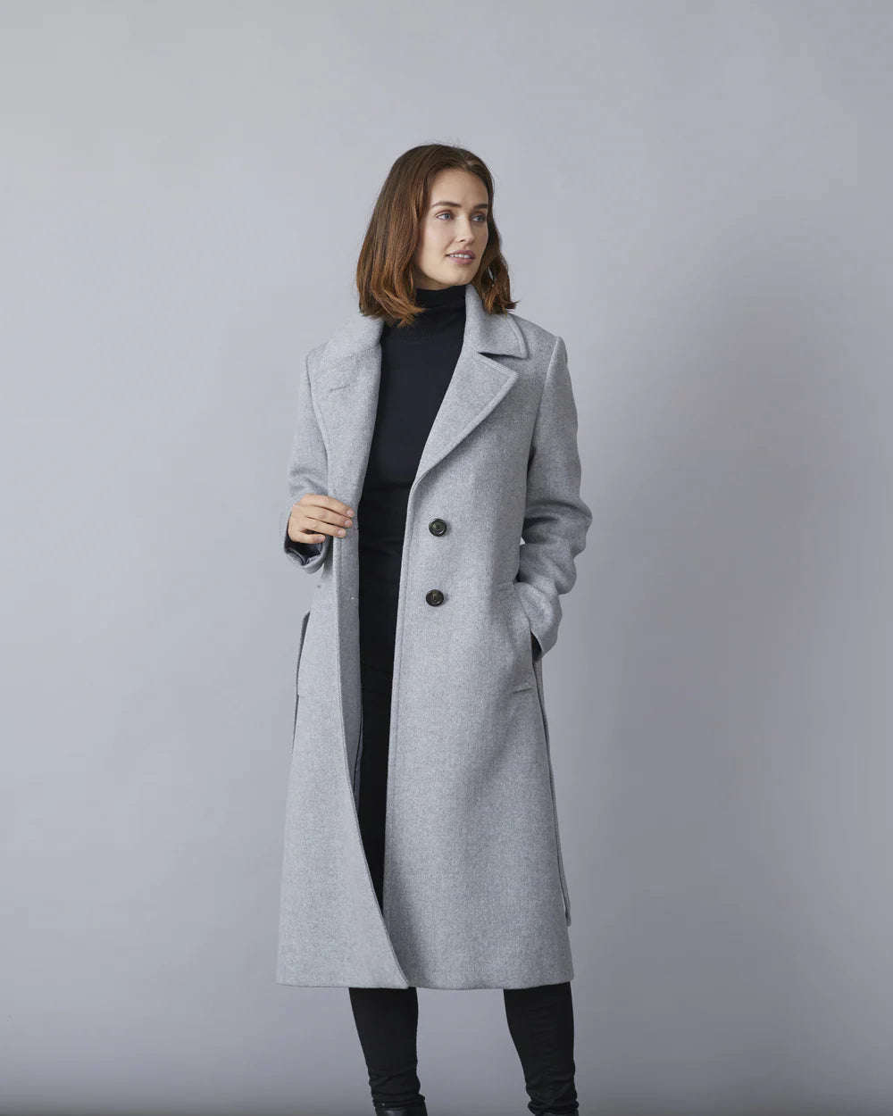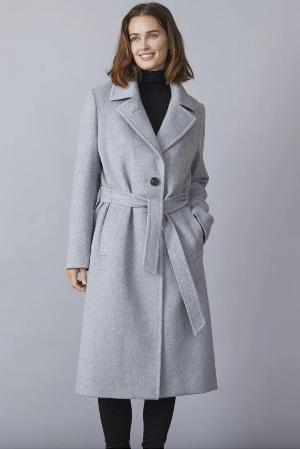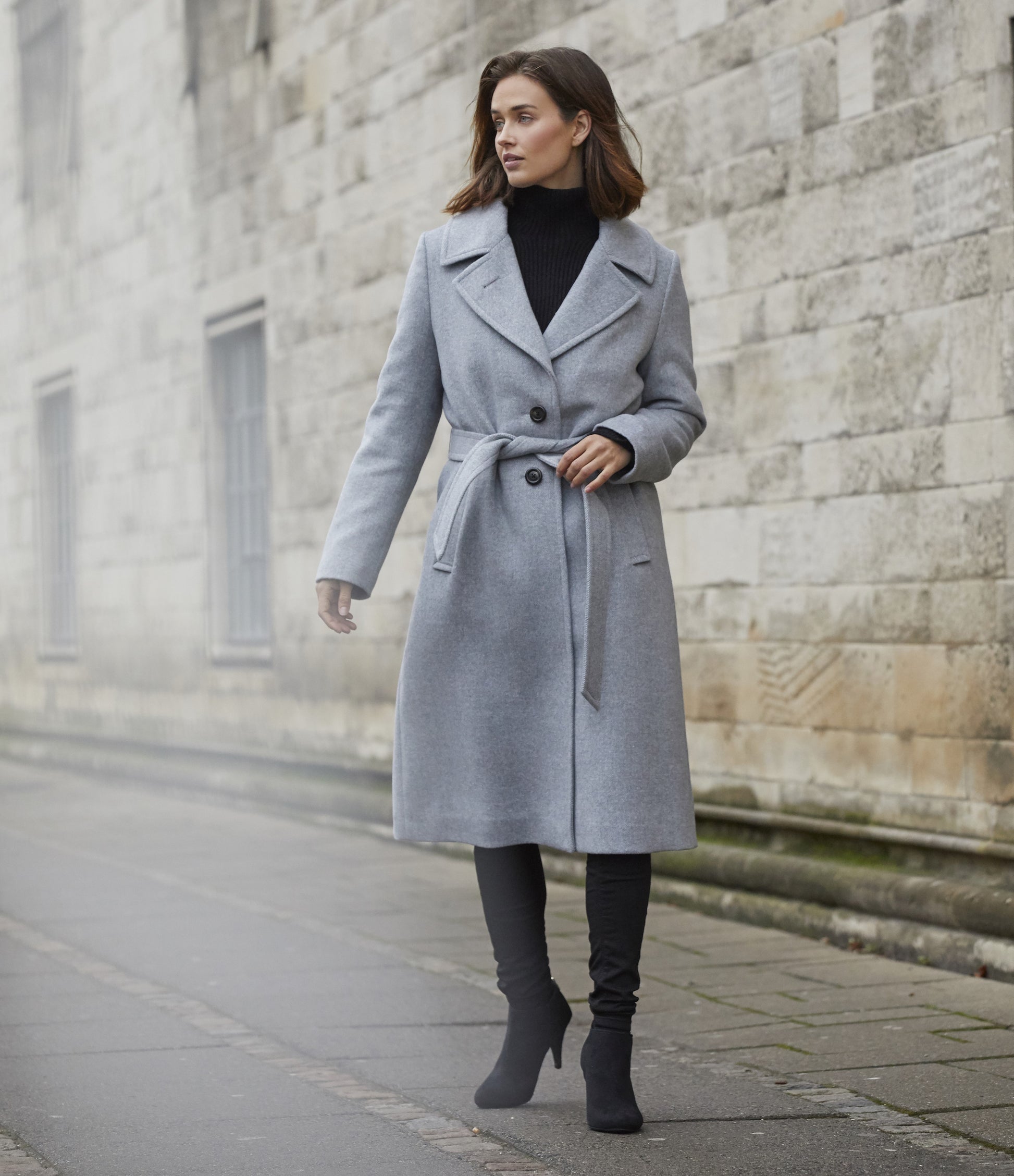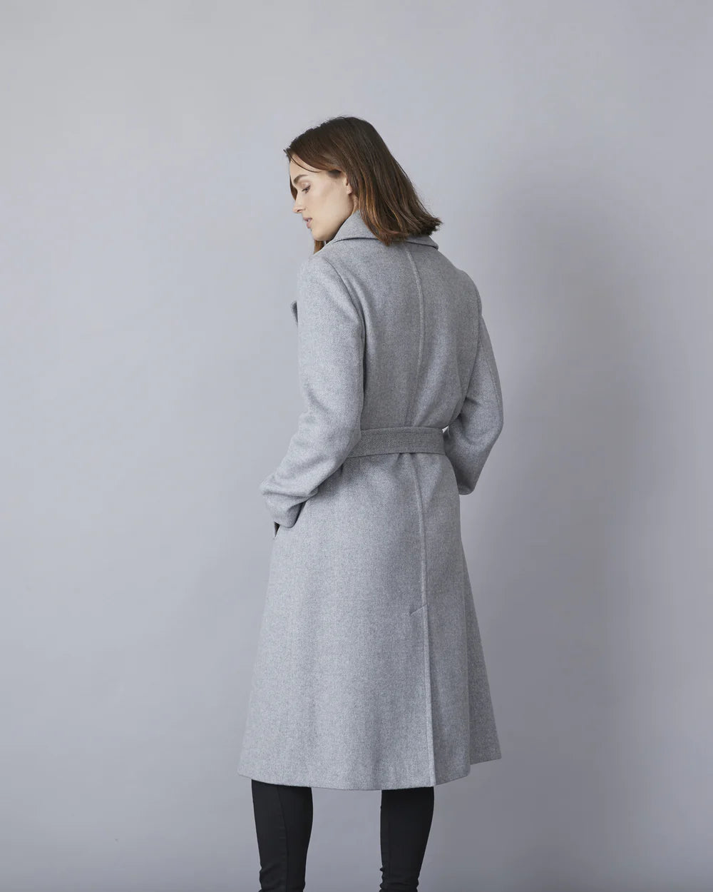 Modern feminin formad kappa i knälång, med nedfälld krage och stickade detaljer.