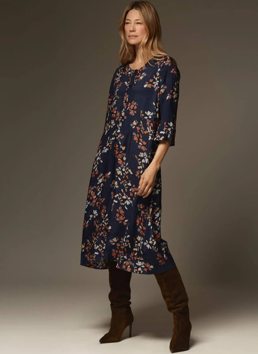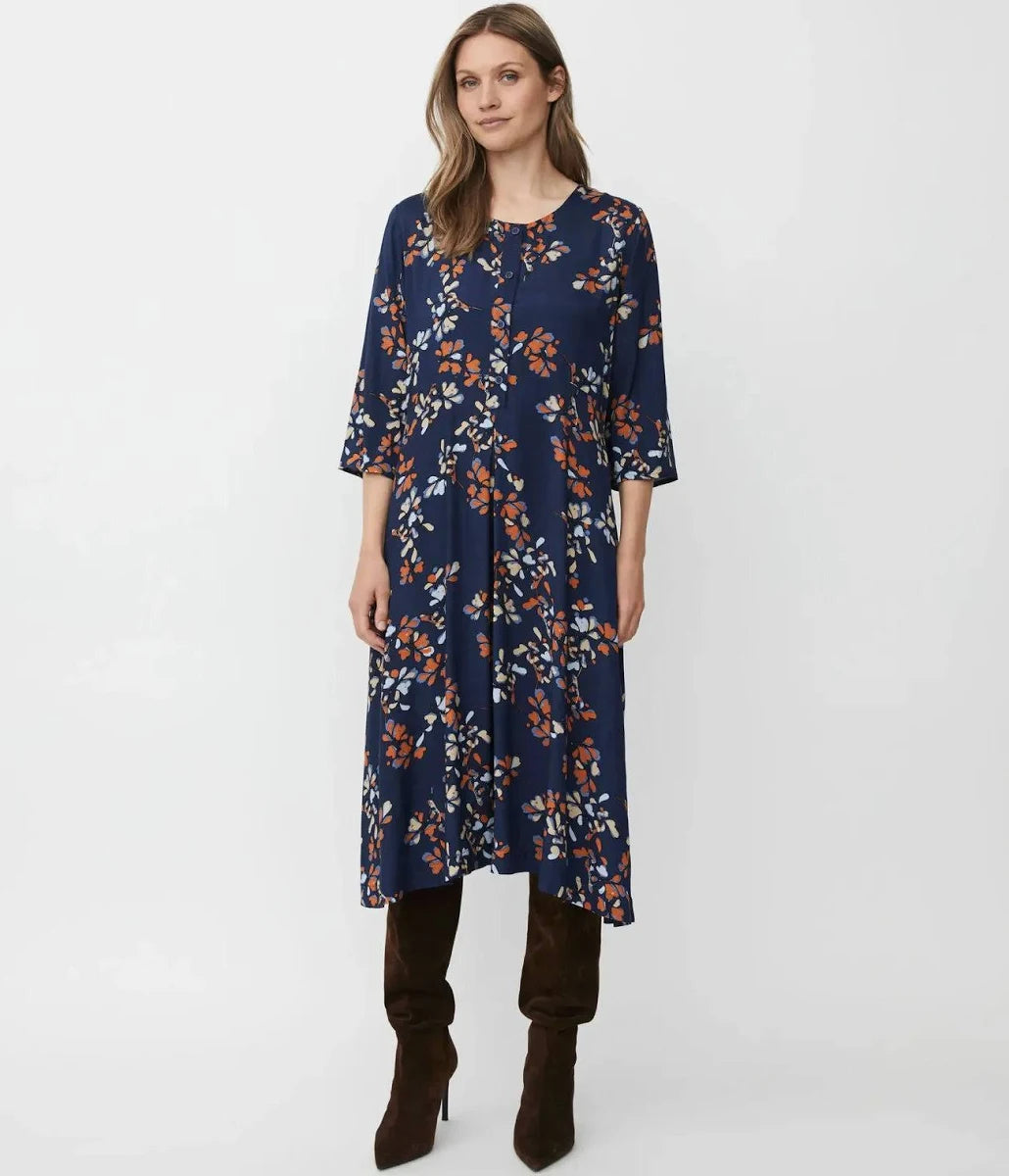 Den här blommiga klänningen är din genväg till en feminin och personlig stil. De orange blommorna lyser vackert mot den mörkblå botten och ger outfiten karaktär. Klänningen har trekvartsärmar, knappar framtill och en mjuk resår baktill som framhäver figuren på ett smickrande sätt. Den silkesmjuka viskosen är skuren i vår Shaped-passform som följer kroppen utan att sitta åt. En elegant och bekväm klänning – perfekt både till vardag och fest.