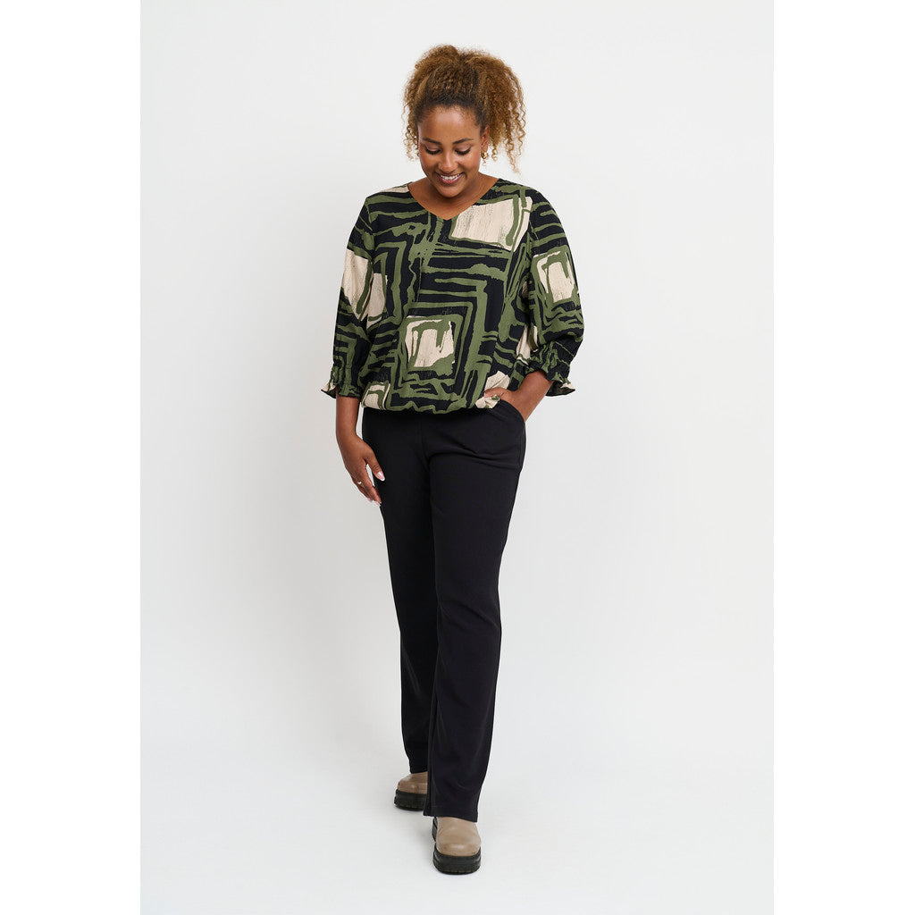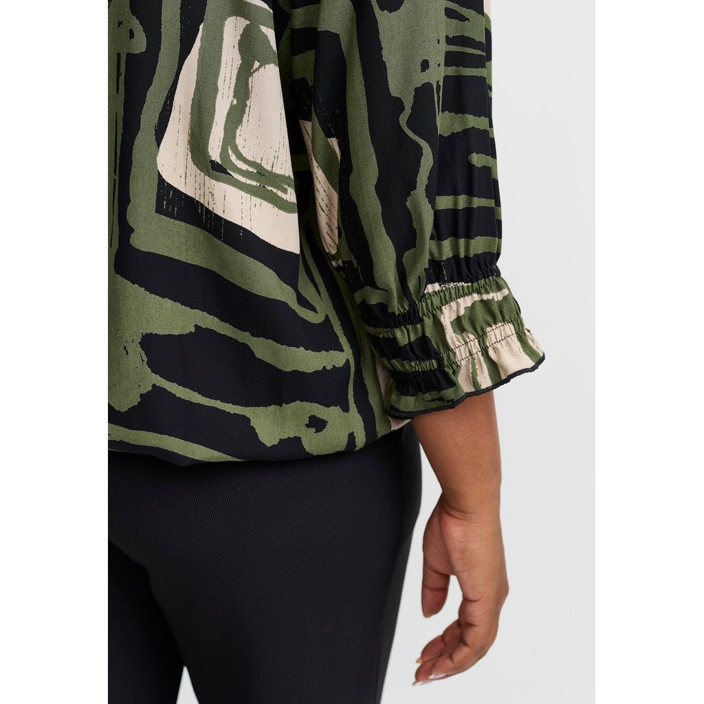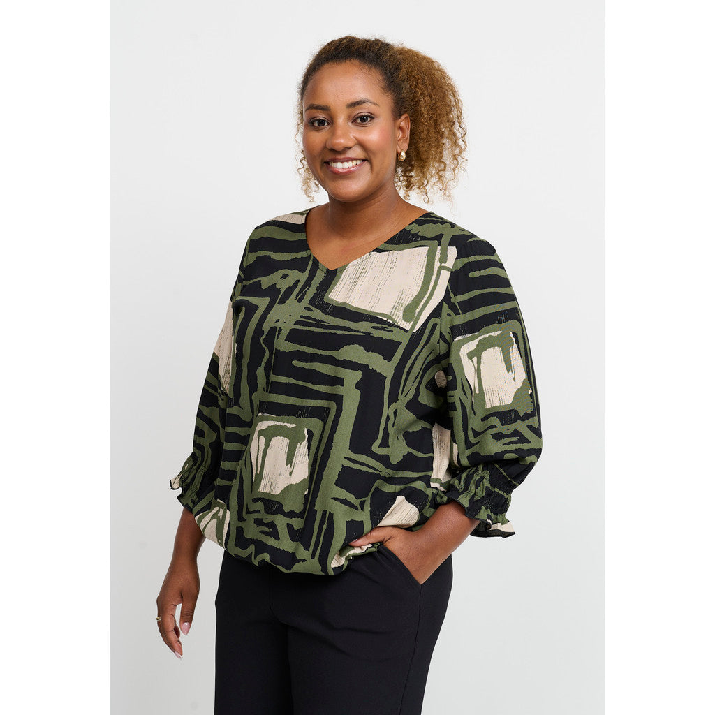 Stilren och modern blus i gröna och svarta toner med ett grafiskt mönster. Blusens fåll har en smickrande ballongeffekt som skapar en mjuk volym och en rundad silhuett. Med en vid rund urringning och trekvartsärmar är blusen avslappnad och feminin. Det rena viskostyget känns mjukt och lätt mot huden, vilket garanterar komfort hela dagen.