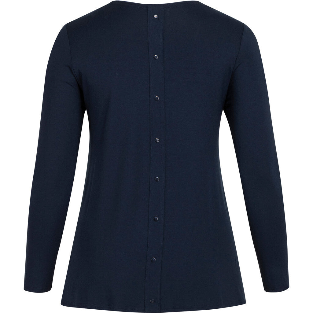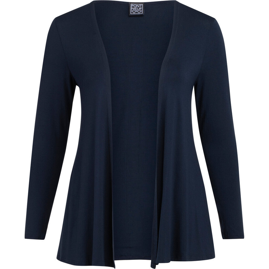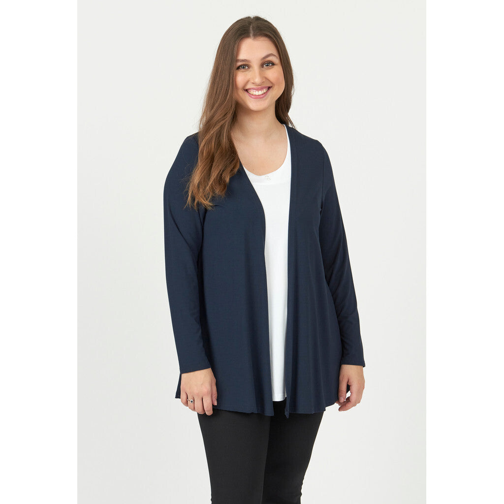 Löst sittande kofta med långa ärmar och detaljerad med knappar baktill. Modellen är öppen framtill och är något A-formad.