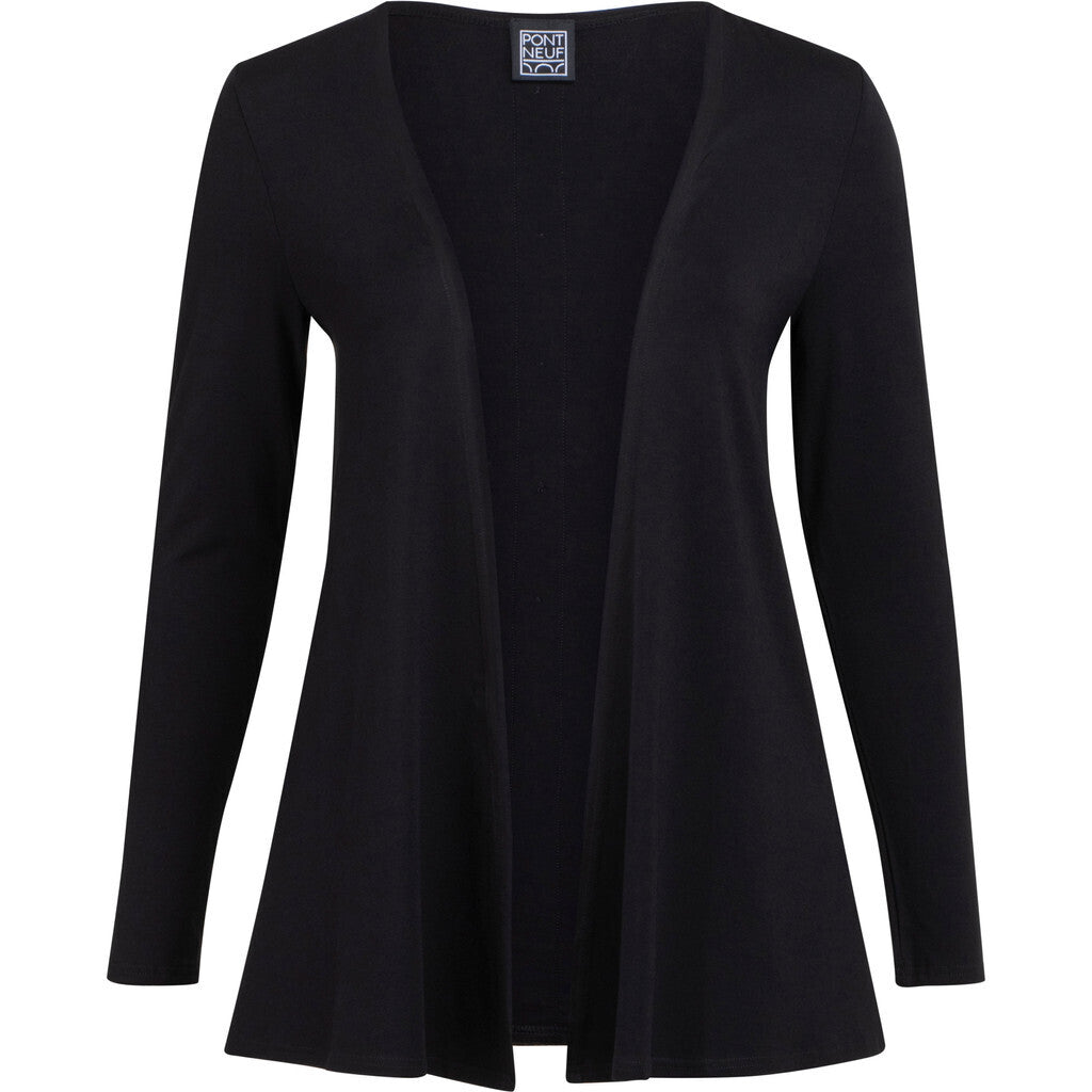 Löst sittande kofta med långa ärmar och detaljerad med knappar baktill. Modellen är öppen framtill och är något A-formad.